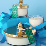 The large version Golden Moments Candle, filled exclusively with our Sea Pines scent, made to shine on any coffee table. The brass lid and finial create a subtle golden gleam, making it an elegant hostess gift or a festive way to brighten your holiday decor.